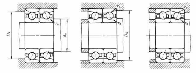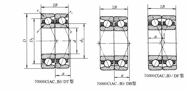 符合含义与应用 DT—成对串联安装 DB—成对背对背安装 DF—成对面对面安装 | 能承以径向载荷为主的径向、轴向联合载荷,也可承受纯径向载荷。串联配置只能承受单一方向的轴向载荷,其他两种配置可承受任一方向的轴向载荷。生产厂按一定的预紧载荷要求,选配组合成对提供用户,用户安装紧固后,套圈和钢球处于预紧状态,提高了组合轴承的刚性。DB的刚性和承受倾覆力矩性能好,DF的刚性和承受倾覆力矩性能不如DB。 | |||||||||||||||||||
