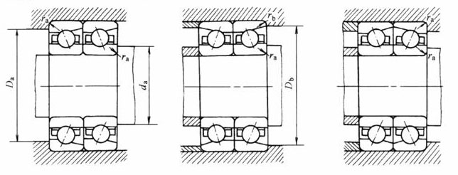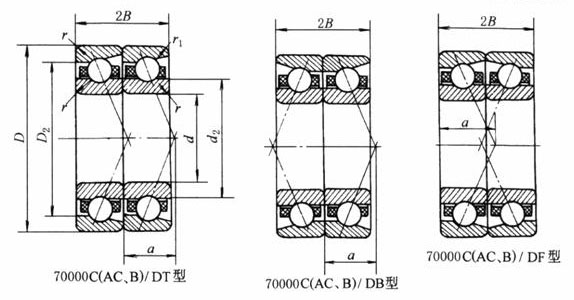 符合含义与应用 DT—成对串联安装 DB—成对背对背安装 DF—成对面对面安装 | 能承以径向载荷为主的径向、轴向联合载荷,也可承受纯径向载荷。串联配置只能承受单一方向的轴向载荷,其他两种配置可承受任一方向的轴向载荷。生产厂按一定的预紧载荷要求,选配组合成对提供用户,用户安装紧固后,套圈和钢球处于预紧状态,提高了组合轴承的刚性。DB的刚性和承受倾覆力矩性能好,DF的刚性和承受倾覆力矩性能不如DB。 | |||||||||||||||||||