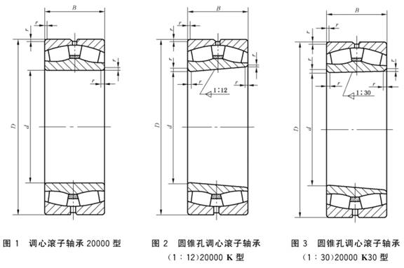 径向当量动载荷:当Fa/Fr≤e 时,Pr=Fr+Y1Fa 当Fa/Fr>e 时,Pr=0.67Fr+Y2Fa 径向当量静载荷:P0r=Fr+Y0Fa 符号含义及应用 CC—内圈无挡边,带活动中挡圈,冲压保持架,滚子和滚道经优化设计的结构,有助于滚子引导,减少摩擦发热 K—圆锥孔,锥度1:12 K30—圆锥孔,锥度1:30 W33—轴承外圈上有润滑油槽和三个油孔 TN—工程塑料成形保持架 能自动调心,主要承受径向载荷,同时也能承受双向轴向载荷。锥孔者,可装在紧定套或退卸套上,便于在光轴上或阶梯轴上任何位置安装,也可调整轴承的径向游隙。 应优先选用结构经优化设计的20000CC型和20000TN型产品。 |