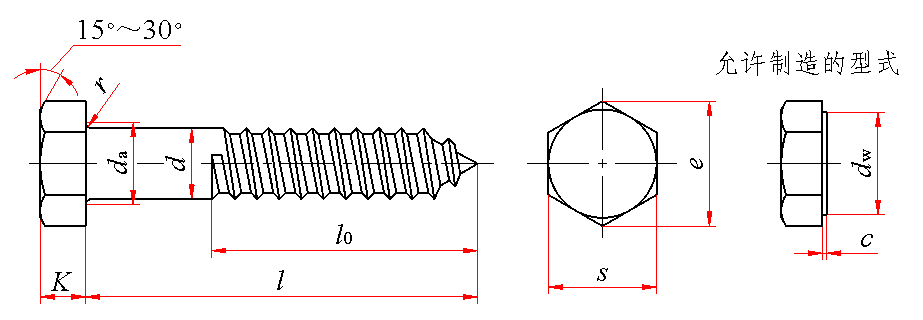 标记示例: 公称直径10mm、长度100mm、材料为Q215、不经表面处理的六角头木螺钉的标记: 木螺钉 GB 102 10×100 |
