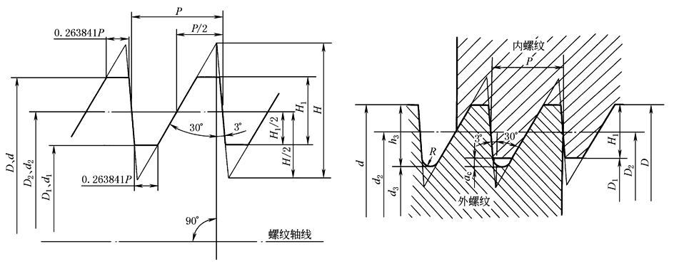 D2=d2=d-H1=d-0.75P; D1=d-2H1=d-1.5P; d3=d-2h3=d-1.735534P; R=0.124271P; 牙顶宽=牙底宽=0.263841P |