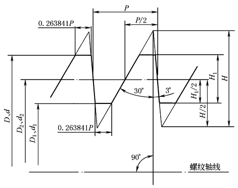 基本牙型 D—内螺纹大径;d1—外螺纹小径;d—外螺纹大径;P—螺距; D2—内螺纹中径;H—原始三角形高度;d2—外螺纹中径; H1—基本牙型高度;D1—内螺纹小径;