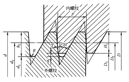 内、外螺纹的设计牙型 H1=0.75P; D2=d2=d-H1=d-0.75P; ac=0.117767P; D1=d-2H1=d-1.5P; h3=H1+ac=0.867767P; d3=d-2h3=d-1.735534P; D=d; R=0.124271P; H=1.587911P; 牙顶宽=牙底宽=0.263841P mm |