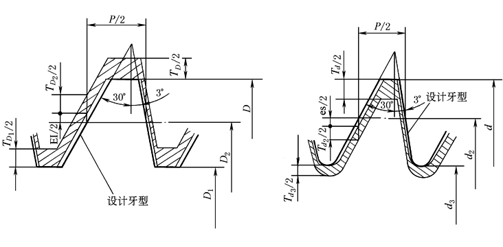 Td— 外螺纹大径公差; Td2— 外螺纹中径公差; Td3— 外螺纹小径公差; es— 上偏差 |