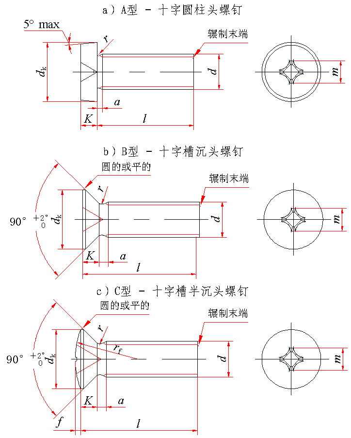 标记示例: 螺纹规格d=M1.6、公称长度l=2.5mm、产品等级为F级、不经表面处理、用Q215制造的A型——十字槽圆柱头螺钉的标记: 螺钉 GB/T 13806.1 M1.6×2.5 螺纹规格d=M1.6、公称长度l=2.5mm、产品等级为A级、不经表面处理、用H68制造的A型——十字槽圆柱头螺钉的标记: 螺钉 GB/T 13806.1 M1.6×2.5A-H68 螺纹规格d=M1.6、公称长度l=2.5mm、产品等级为F级、不经表面处理、用Q215制造的B型——十字槽沉头螺钉的标记: 螺钉 GB/T 13806.1 BM1.6×2.5 螺纹规格d=M1.6、公称长度l=2.5mm、产品等级为A级、不经表面处理、用H68制造的B型——十字槽沉头螺钉的标记: 螺钉 GB/T 13806.1 BM1.6×2.5A-H68 螺纹规格d=M1.6、公称长度l=2.5mm、产品等级为F级、不经表面处理、用Q215制造的C型——十字槽半沉头螺钉的标记: 螺钉 GB/T 13806.1 CM1.6×2.5 螺纹规格d=M1.6、公称长度l=2.5mm、产品等级为A级、不经表面处理、用H68制造的C型——十字槽半沉头螺钉的标记: 螺钉 GB/T 13806.1 CM1.6×2.5A-H68 |