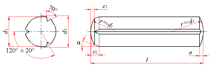 α=15°~30°; 70°槽角仅适用于由碳钢制造的槽销。槽角应按材料的弹性进行修正 |
