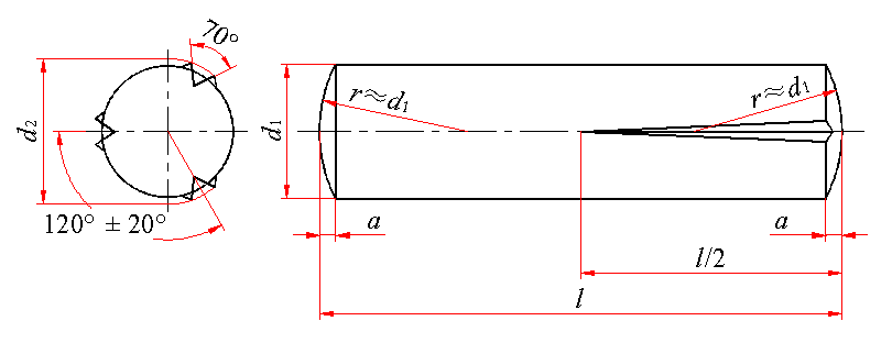 标记示例: 公称直径 d1=6mm、公称长度 l=50mm、材料为碳钢、硬度为125~245 HV30、不经表面处理的半长锥槽的槽销的标记: 销 GB/T 13829.6 6×50 公称直径 d1=6mm、公称长度 l=50mm、材料为A1组奥氏体不锈钢、硬度为210~280 HV30、表面简单处理的半长锥槽的槽销的标记: 销 GB/T 13829.6 6×50-A1 |