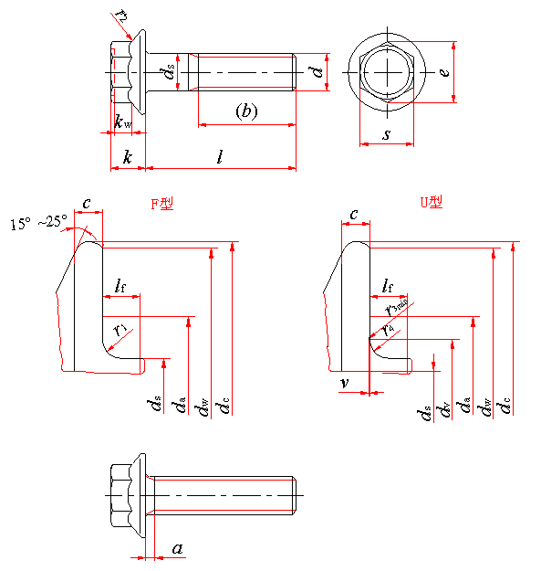 标记示例: 螺纹规格d =M12×1.25、细牙螺纹、公称长度l=80mm、由制造者任选F型或U型、性能等级为8.8级、表面氧化、产品等级为A级的小六角系列六角法兰面螺栓的标记: 螺栓 GB/T 16674.2 M12×1.25×80 螺纹规格d =M12×1.25、细牙螺纹、公称长度l=80mm、F型、性能等级为8.8级、表面氧化、产品等级为A级的小六角系列六角法兰面螺栓的标记: 螺栓 GB/T 16674.2 M12×1.25×80-F 如在特殊情况下,要求细杆型式时,则应在标记中增加“R”: 螺栓 GB/T 16674.2 M12×1.25×80-R | ||||||||
