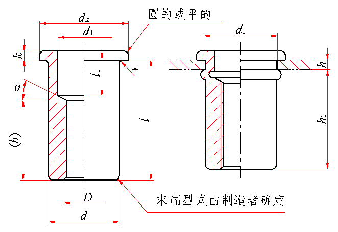 标记示例: 螺纹规格D=M8、长度规格l=15mm、材料为ML10、表面镀锌钝化的平头铆螺母的标记示例: 铆螺母 GB/T 17880.1 M8×15 |