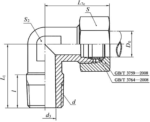 图2 卡套式锥螺纹弯通接头体 标记示例: 接头系列为L,管子外径为10 mm,55°密封管螺纹(R),表面镀锌处理的钢制卡套式锥螺纹弯通管接头标记为: 管接头 GB/T 3739 L10/R1/4 接头系列为L,管子外径为10 mm,55°密封管螺纹(R),表面镀锌处理的钢制卡套式锥螺纹弯通接头体标记为: 接头体 GB/T 3739 L10/R1/4 |