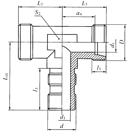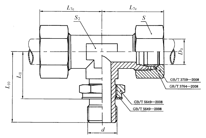 图2 卡套式可调向端三通接头体 标记示例 接头系列为L,管子外径为10 mm,普通螺纹(M)可调向螺纹柱端,表面镀锌处理的钢制卡套式可调向端三通管接头标记为: 管接头 GB/T 3741 L10 接头系列为L,管子外径为10 mm,普通螺纹(M)可调向螺纹柱端,表面镀锌处理的钢制卡套式可调向端三通接头体标记为: 接头体 GB/T 3741 L10 |