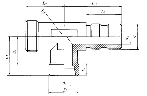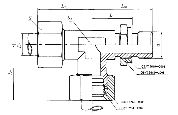 图2 卡套式可调向端弯通三通接头体 标记示例: 接头系列为L,管子外径为10 mm,普通螺纹(M)可调向螺纹柱端,表面镀锌处理的钢制卡套式可调向端弯通三通管接头标记为; 管接头 GB/T 3743 L10 接头系列为L,管子外径为10 mm,普通螺纹(M)可调向螺纹柱端,表面镀锌处理的钢制卡套式可调向端弯通三通接头体标记为: 接头体 GB/T 3743 L10 |