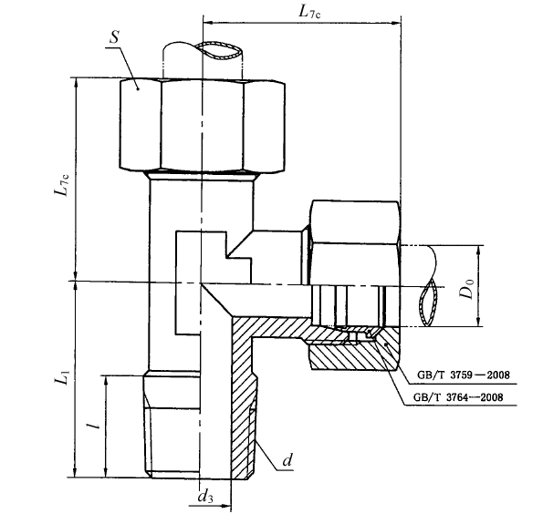 标记示例 接头系列为L,管子外径为10 mm,55°密封管螺纹(R),表面镀锌处理的钢制卡套式锥螺纹弯通三通管接头标记为: 管接头 GB/T 3744 L10/R1/4 接头系列为L,管子外径为10 mm,55°密封管螺纹(R),表面镀锌处理的钢制卡套式锥螺纹弯通三通接头体标记为: 接头体 GB/T 3744 L10/R1/4 |