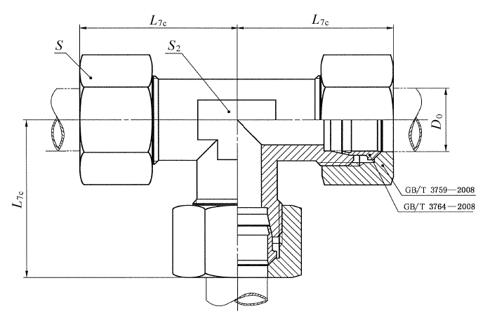 图2 卡套式三通接头体 标记示例: 接头系列为L,管子外径为10 mm,表面镀锌处理的钢制卡套式三通管接头标记为: 管接头 GB/T 3745 L10 接头系列为L,管子外径为10 mm,表面镀锌处理的钢制卡套式三通接头体标记为: 接头体 GB/T 3745 L10 |