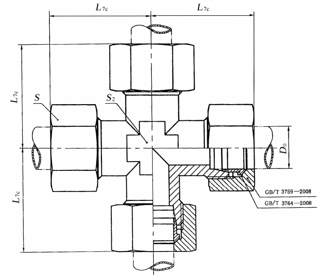 图2 卡套式四通接头体 标记示例 接头系列为L,管子外径为10 mm,表面镀锌处理的钢制卡套式四通管接头标记为: 接头 GB/T 3746 L10 接头系列为L,管子外径为10 mm,表面镀锌处理的钢制卡套式四通接头体标记为: 接头体 GB/T 3746 L10 |