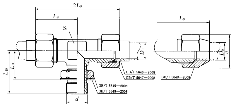 扩口式可调向端三通管接头和接头体尺寸(摘自GB/T 5633—2008) mm |