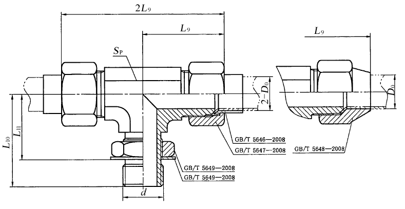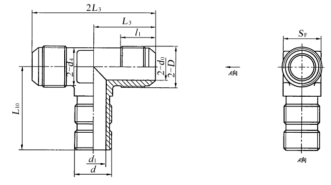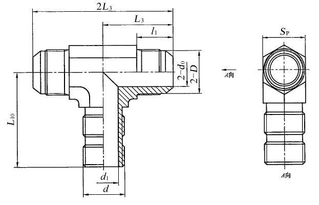 图4 扩口式可调向端三通接头体 标记示例 扩口型式A,管子外径为10 mm,普通螺纹(M)可调向螺纹柱端,表面镀锌处理的钢制扩口式可调向端三通管接头标记为: 管接头 GB/T 5633 A10 扩口型式A,管子外径为10 mm,普通螺纹(M)可调向螺纹柱端,表面镀锌处理的钢制扩口式可调向端三通接头体标记为: 接头体 GB/T 5633 A10 |
