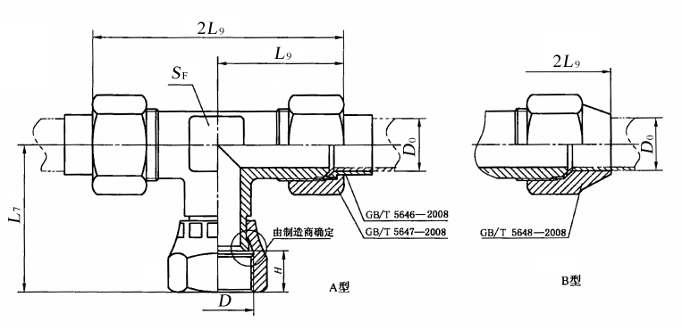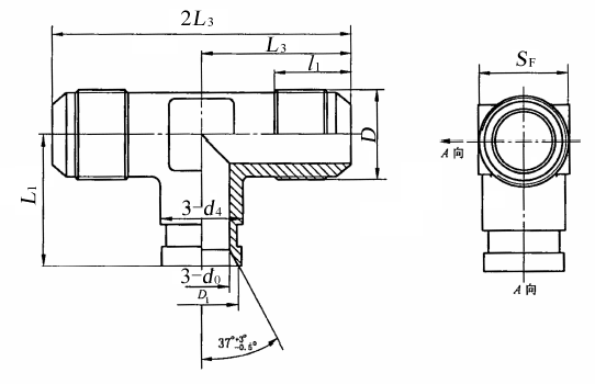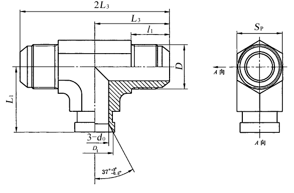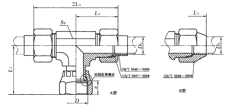 图4 扩口式组合三通接头体 标记示例 扩口型式A,管子外径为10mm,表面镀锌处理的钢制扩口式组合三通管接头标记为: 管接头 GB/T 5638 A10 扩口型式A,管子外径为10mm,表面镀锌处理的钢制扩口式组合三通接头体标记为: 接头体 GB/T 5638 A10 |