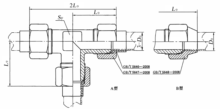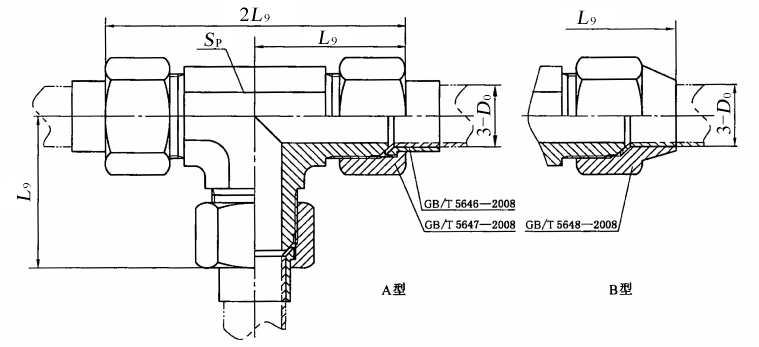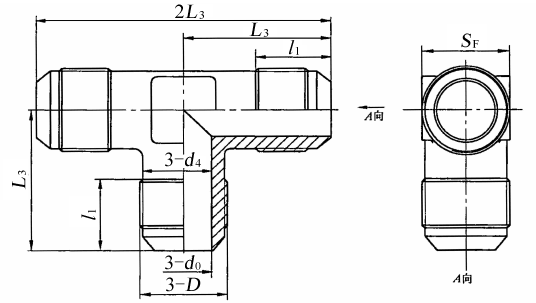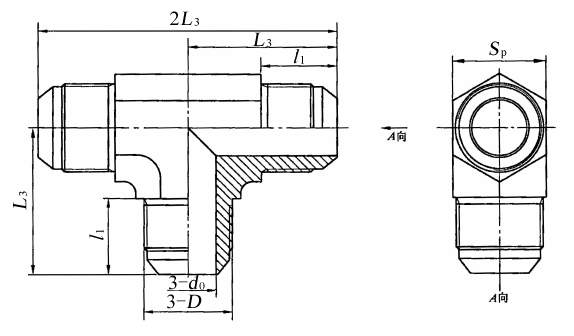 图4 扩口式三通接头体 标记示例 扩口型式A,管子外径为10 mm,表面镀锌处理的钢制扩口式三通管接头标记为: 管接头 GB/T 5639 A10 扩口型式A,管子外径为10 mm,表面镀锌处理的钢制扩口式三通接头体标记为: 接头体 GB/T 5639 A10 |