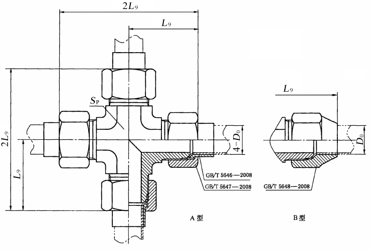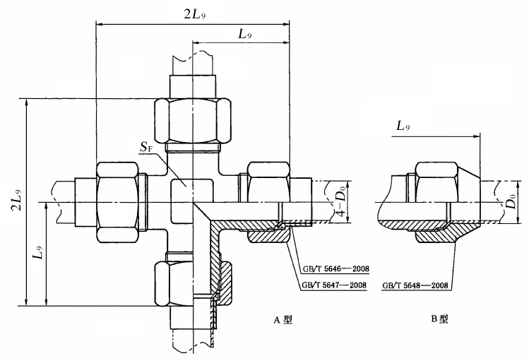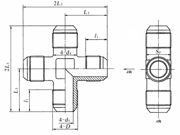 图4 扩口式四通接头体 标记示例 扩口型式A,管子外径为10 mm,表面镀锌处理的钢制扩口式四通管接头标记为: 管接头 GB/T 5641 A10 扩口型式A,管子外径为10 mm,表面镀锌处理的钢制扩口式四通接头体标记为: 接头体 GB/T 5641 A10 |