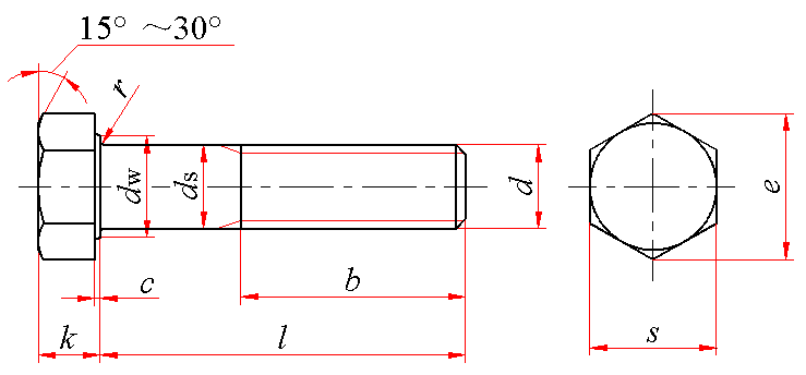 注:1.带括号的规格为非优选的螺纹规格。 2.A级用于d=8~24mm和l≤10d或l≤150mm(按较小值);B级用于d>24mm或l>10d或l>150mm(按较小值)的螺栓。 3.螺纹末端应倒角,按(GB/T 2)。 | |||||||||||||