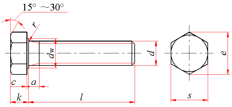 注:1.带括号的规格为非优选的螺纹规格。 2.A级用于d=8~24mm和l≤10d或l≤150mm(按较小值);B级用于d>24mm或l>10d或l>150mm(按较小值)的螺栓。 3.螺纹末端应倒角(GB/T 2)。 | |||||||||