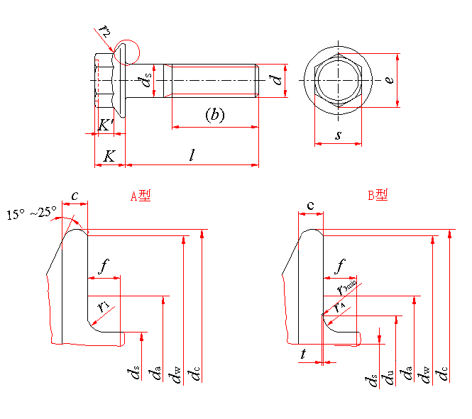 标记示例: 螺纹规格d=M12、公称长度l=80mm、性能等级为8.8级、表面氧化、A或B型的六角法兰面螺栓的标记: 螺栓 GB 5789 M12×80 螺纹规格d=M12、公称长度l=80mm、性能等级为8.8级、表面氧化、A型的六角法兰面螺栓的标记: 螺栓 GB 5789 AM12×80 |