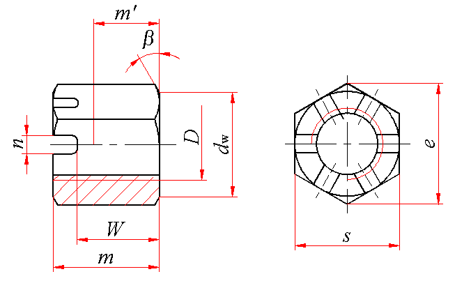 β=15°~30°;槽的底部允许制成平底;(m-W)长度内允许制成喇叭形的螺纹孔;六角与螺母开槽端的端面交接处允许有圆钝。 |