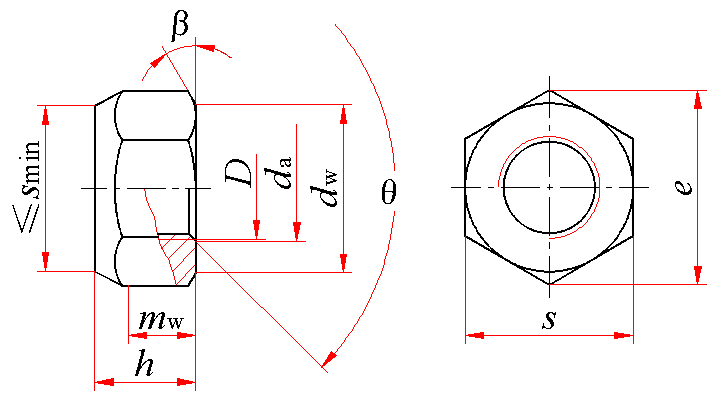 螺纹规格 D×P | da | dw min | e min | h | mw min | s | |||