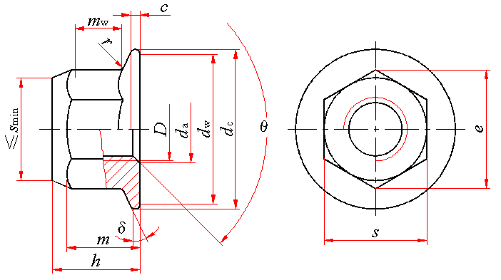 标记示例: 螺纹规格D=M12×1.5、细牙螺纹、性能等级为8级、表面氧化、产品等级为A级的全金属六角法兰面锁紧螺母的标记: 螺母 GB/T 6187.2 M12×1.5 | |||||||||||||