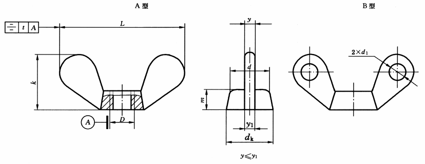 标记示例: 螺纹规格D=M10、材料为Q215、保证扭矩为I级、表面氧化处理、两翼为半圆形的A型蝶形螺母的标记: 螺母 GB/T 62.1 M10 |