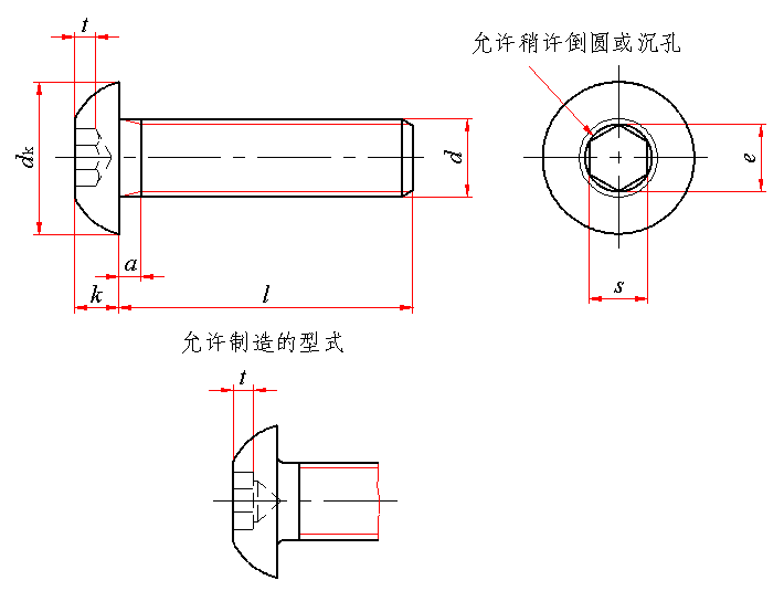 注:对切制内六角,当尺寸达到最大极限时,由于钻孔造成的过切不应超过内六角任何一面长度(t)的20%。 1)内六角口部允许稍许倒圆或沉孔。 2)末端倒角,d≤M4的为辗制末端,见GB/T2。 3)不完整螺纹的长度u≤2P。 | ||||||||||||||||||||||||||||