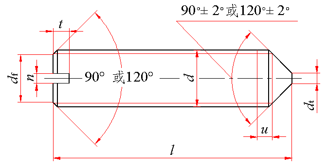 公称长度在表中括号内的短螺钉应制成120°;90°或120°仅适用于螺纹小径以内的末端部分;u(不完整螺纹的)≤2P |