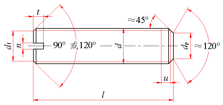 公称长度在表中括号内的短螺钉应制成120°;45°仅适用于螺纹小径以内的末端部分;u(不完整螺纹的长度)≤2P。 |