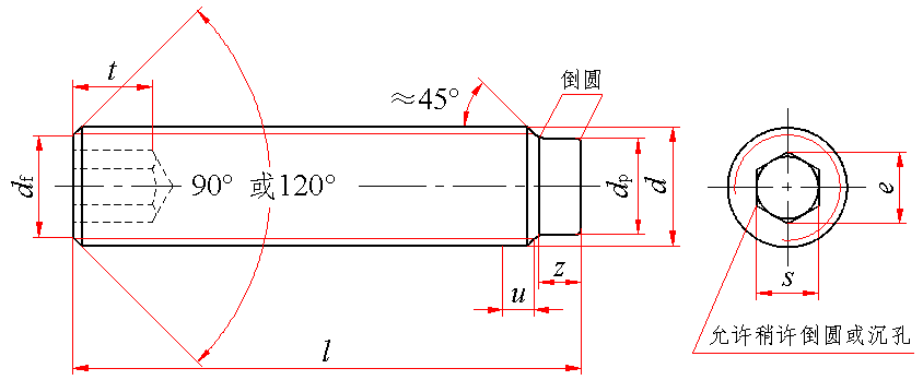 注:对切制内六角,当尺寸达到最大极限时,由于钻孔造成的过切不应超过内六角任何一面长度(t)的20%。 1)公称长度在表中的短螺钉应制成120°; 2)45°角仅适用于螺纹小径以内的末端部分; 3)不完整螺纹的长度u≤2P。