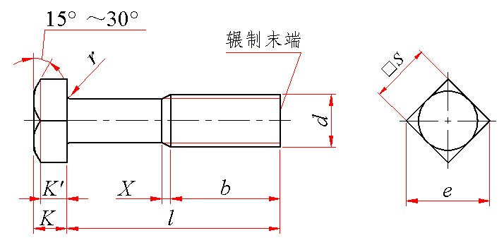 螺纹末端按GB/T 2规定;无螺纹部分杆径约等于螺纹中径或螺纹大径 |