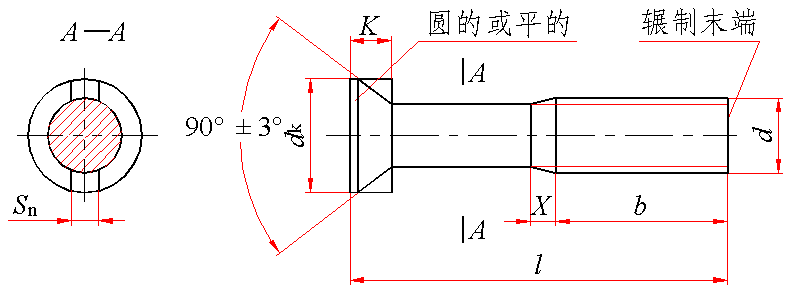 螺纹末端按GB/T 2规定;无螺纹部分杆径约等于螺纹中径或等于螺纹大径 |