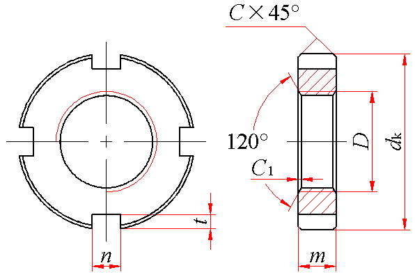 标记示例: 螺纹规格D=M16×1.5、材料为45钢、槽或全部热处理后硬度HRC 35~45、表面氧化的小圆螺母的标记: 螺母 GB 810 M16×1.5 |