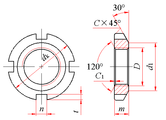 标记示例: 螺纹规格D=M16×1.5、材料为45钢、槽或全部热处理后硬度HRC35~45、表面氧化的圆螺母的标记: 螺母 GB 812 M16×1.5 |
