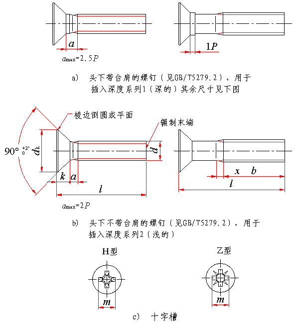 标记示例: 螺纹规格d=M5、公称长度l=20mm、性能等级为8.8级、H型十字槽、其插入深度由制造者任选的系列1或系列2、不经表面处理的十字槽沉头螺钉的标记示例: 螺钉 GB/T 819.2 M5×20 如特殊情况需要指定两个系列之一者,则该系列的数码(如,系列1)应在标记中表示: 螺钉 GB/T 819.2 M5×20-H1 | |||||||||||||