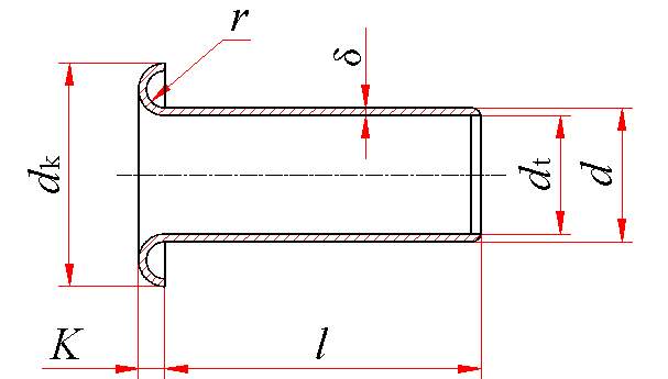 标记示例: 公称直径d=3mm、公称长度l=10mm、材料为H62、不经表面处理的空心铆钉的标记: 铆钉 GB/T 876 3×10 |