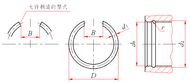 标记示例: 孔径d0=40mm、材料为碳素弹簧钢丝,经低温回火及表面氧化处理的孔用钢丝挡圈的标记: 挡圈 GB/T 895.1 40 |