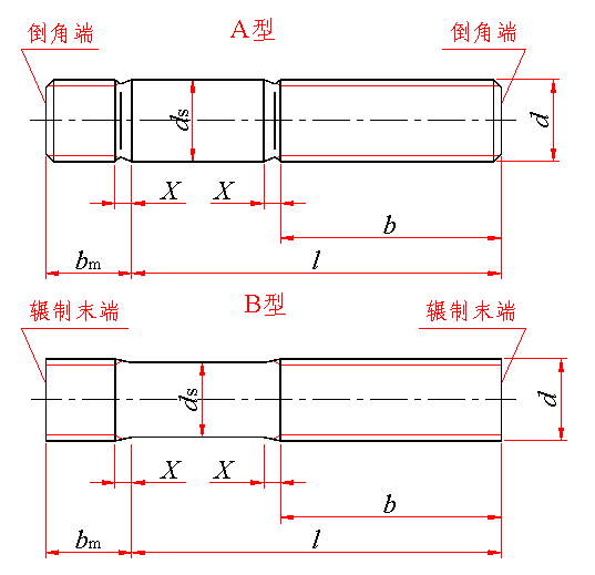 标记示例: 两端均为粗牙普通螺纹,d=10mm、l=50mm、性能等级为4.8级、不经表面处理、B型、bm=1.5d的双头螺柱的标记: 螺柱 GB/T 899 M10×50 旋入机体一端为粗牙普通螺纹,旋螺母一端为螺距P=1mm的细牙普通螺纹,d=10mm、l=50mm、性能等级为4.8级、不经表面处理、A型、bm=1.5d的双头螺柱的标记: 螺柱 GB/T 899 AM10—M10×1×50 旋入机体一端为过渡配合螺纹的第一种配合,旋螺母一端为粗牙普通螺纹,d=10mm、l=50mm、性能等级为8.8级、镀锌钝化、B型、bm=1.5d的双头螺柱的标记: 螺柱 GB/T 899 GM10—M10×50—8.8—Zn·D