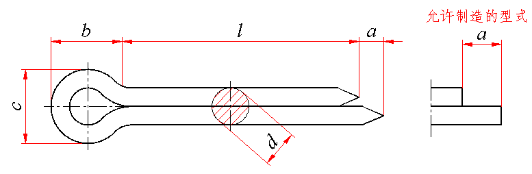 工作质量 | ① 眼圈应尽可能制成圆形; ② 开口销两脚的横截面应为圆形,但允许开口销两脚平面与圆周交接处有半径r=(0.05~0.1)dmax的圆角; ③ 开口销两脚的间隙和两脚的错移量应不大于开口销公称规格与dmax之差值; ④ 开口销允许制成开口的(α——两脚内平面的夹角);公称规格≤1.6mm,α≤8°;2~6.3mm,α≤4°;≥8mm,α≤2° | |||