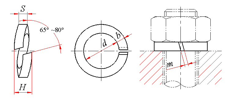 标记示例: 规格16mm、材料为65Mn、表面氧化的标准型弹簧垫圈的标记: 垫圈 GB/T 93 16 |