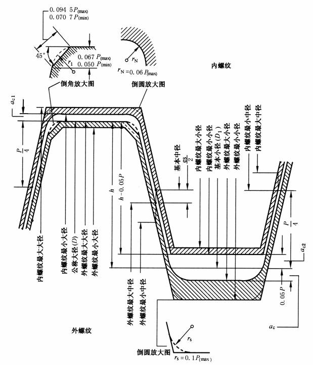 注:容隙(ALLOWANCE)术语是美制螺纹和英制螺纹标准内的重要技术参数,但米制螺纹标准不使用此术语,我国技术人员对此术语的翻译名称也不统一。在爱克母螺纹标准内,容隙对应米制梯形螺纹的外螺纹中径基本偏差(es)。 内螺纹的大径D4、中径D2和小径D3的公差带位置在 H,基本偏差EI=0;外螺纹的大径 d 和小径 d3的公差带位置为h,基本偏差es=0。外螺纹的中径 d2 的基本偏差es为负值。 |