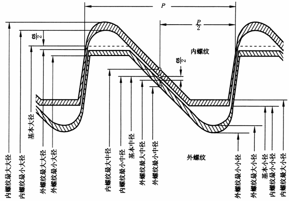注:容隙(ALLOWANCE)术语是美制螺纹和英制螺纹标准内的重要技术参数,但是米制螺纹标准不使用此术语,我国技术人员对此术语的翻译名称也不统一。在英制锯齿形螺纹标准内,容隙对应米制锯齿形螺纹的外螺纹中径基本偏差(es)。 内螺纹的大径D4、中径D2和小径D1的公差带位置为H,基本偏差EI=0;外螺纹的大径d、中径d2和小径d3的基本偏差es为负值。 |