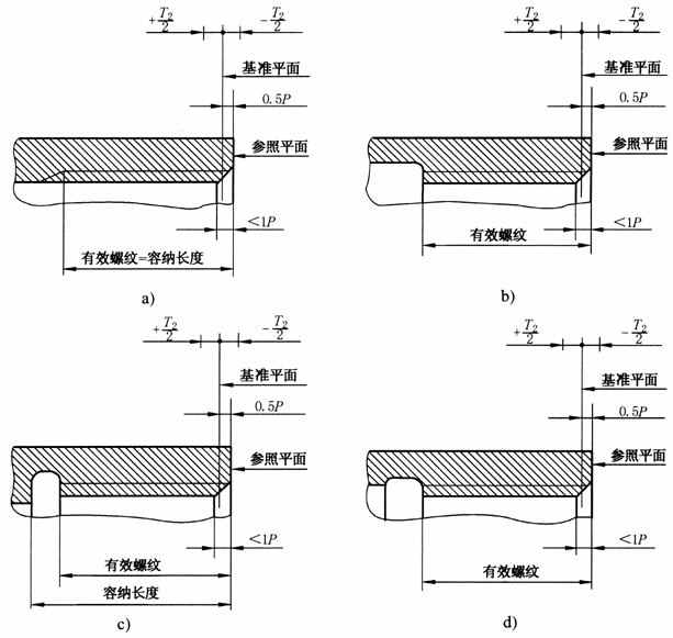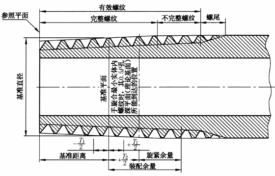 英制密封圆柱和圆锥内螺纹基准平面的理论位置位于垂直于螺纹轴线、深入大端面(参考平面)以内半个螺距的平面内,见右图 |