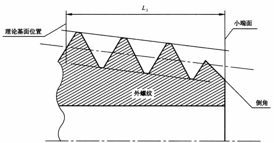 美制一般密封圆锥外螺纹基准平面的理论位置位于垂直于螺纹轴线、与小端面(参考平面)相距一个基准距离的平面内,见右图) |