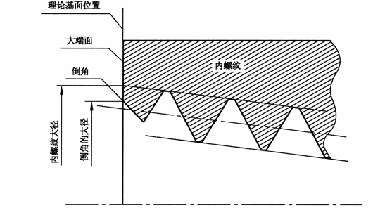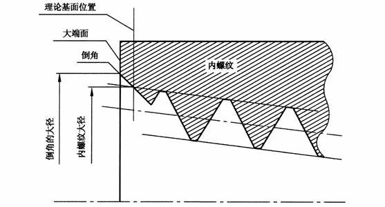 当内螺纹大端面倒角的大径大于内螺纹在此端面内的大径时,内螺纹基准平面的理论位置位于内螺纹大径圆柱或大径圆锥与倒角圆锥相交轴向位置、垂直于螺纹轴线的平面内,见右图) |